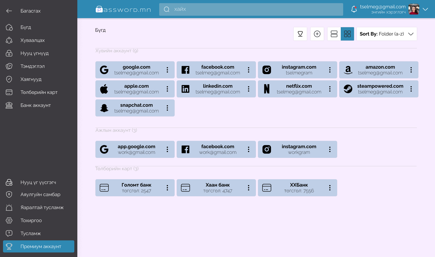 Password.mn бүтээгдэхүүн нь хувь хүний, албан байгууллагын дижитал орчинд ашиглагддаг нууц үг, тэмдэглэл, календар гэх мэт хувийн болон байгууллагын бүх төрлийн нууцын зэрэглэлт мэдээллүүдийг төвлөрүүлэн хадгалж менежмент хийх монголын хамгийн анхны кибер аюулгүй байдлын платформ юм.